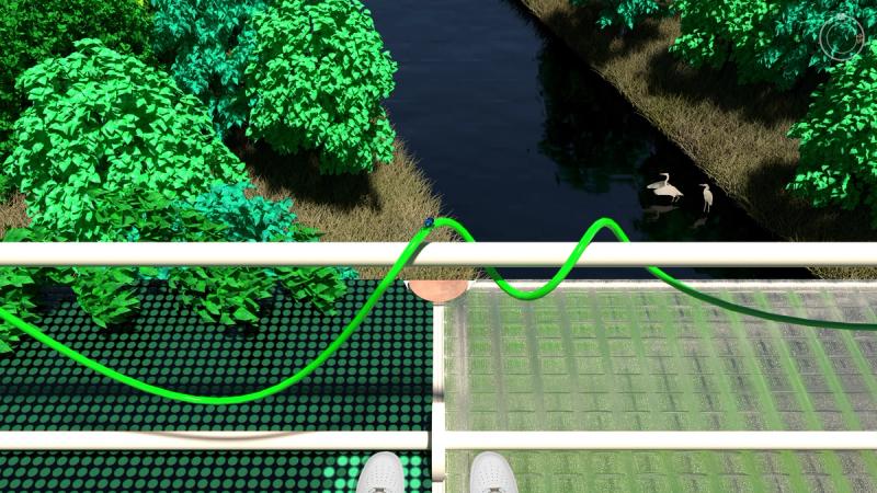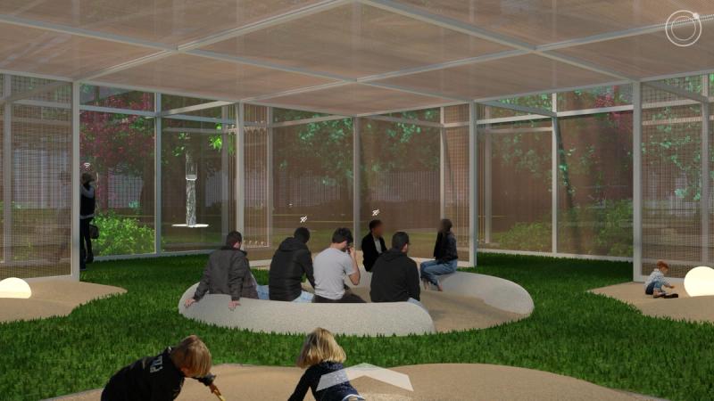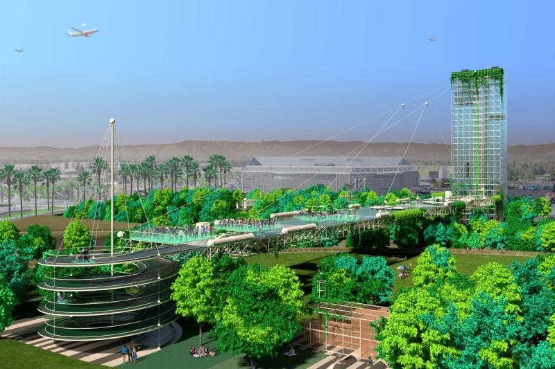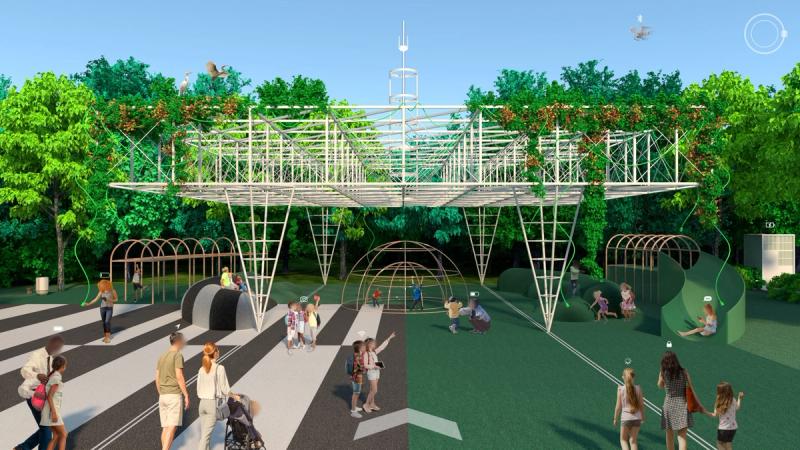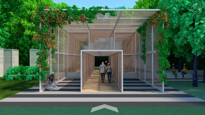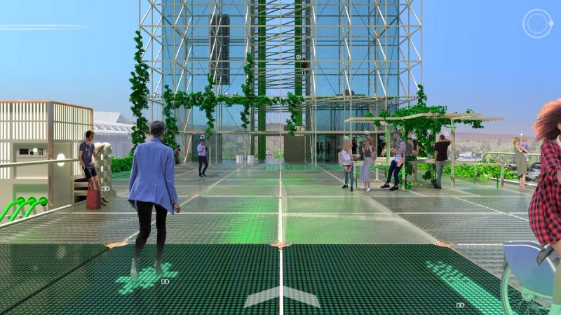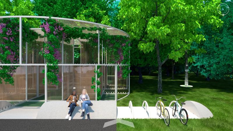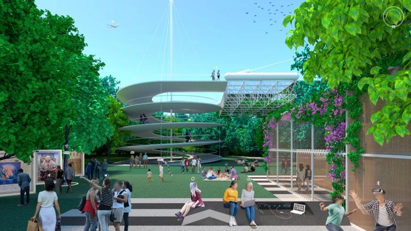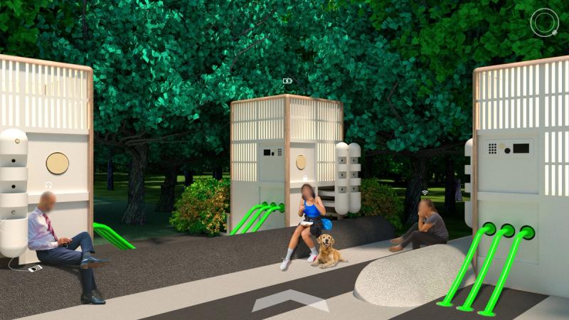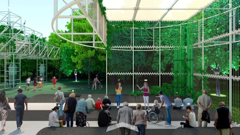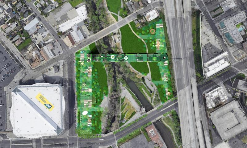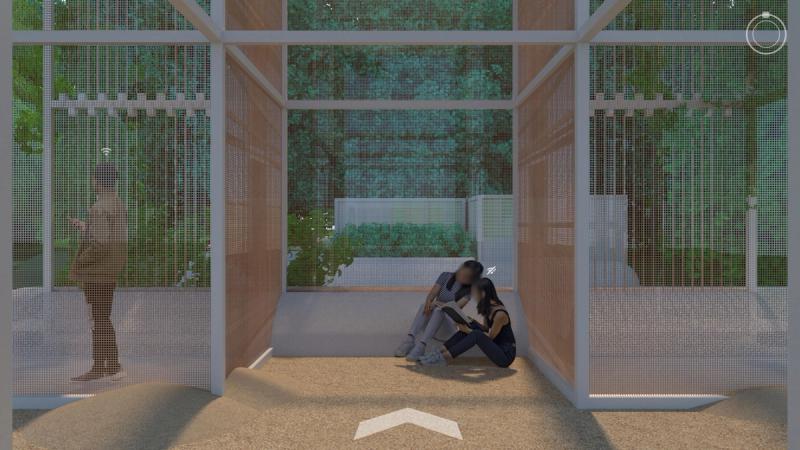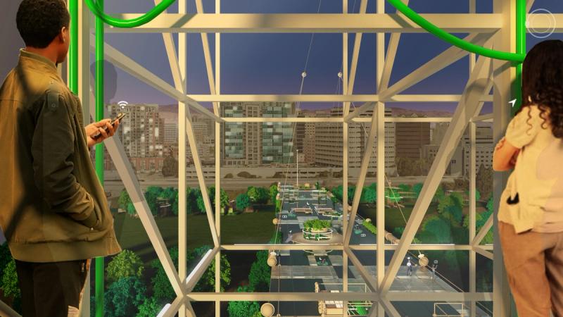 Digital Commons is a public space proposal for San Jose that responds to public life in a digital world. To the east and west are two zones that complexly intertwine nature, culture, and technology, exploring connection and disconnection within urbanity and digital life. Spread across these zones are a distributed Digital Forest, in which trees work together with new pavilions to provide free public WiFi through a wireless mesh network. Visitors navigate a lushly forested landscape, but enhanced with pervasive digital connectivity. Pavilions throughout sponsor a diversity of physical and online activities, while providing stations to plug in, sit down, and charge up. Nestled within the Digital Forest are enclosures called Reflectories. These spaces afford the rare opportunity to disconnect. Each Reflectory is clad in a mesh enclosure through which cellular signals cannot penetrate. Designed in varying sizes and configurations, individual Reflectories afford space for deliberately offline activities ranging from meditation, to conversation, to group discussions. At the center of the proposal is an area called the Observatory. Comprising an expansive elevated platform that bridges the Guadalupe River and an immense elevator tower, the Observatory explores the various ways that we see and are seen in today’s digitally expanded public sphere. The elevator stops at grade to load passengers before traveling 200’ into the air to provide dramatic views of the surrounding urban context, and finally lands at platform level. The platform is designed in accordance with the pixel-logic of the digital image. From some altitudes, it appears to blend into the surroundings as a seamless aerial image; while from others, the cellular logic of the platform surface becomes clear, appearing as a low-resolution glitch in a hi-res context. From the platform, occupants are afforded views of the riparian zone below, while one’s motion along an energy-harvesting kinetic floor activates dynamic lighting visible from the surroundings, the air, and even digital satellite. Team: McLain Clutter, Cyrus Peñarroyo, Reed Miller, Anne Redmond Year: 2020