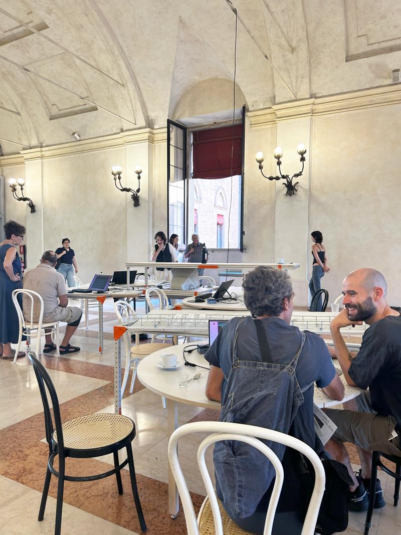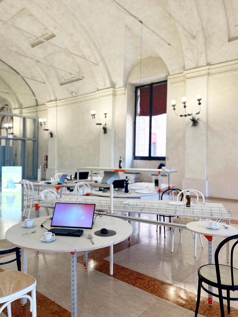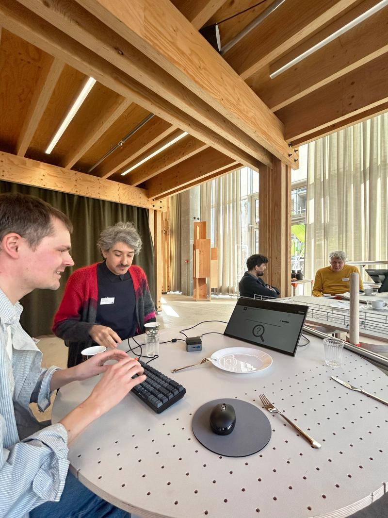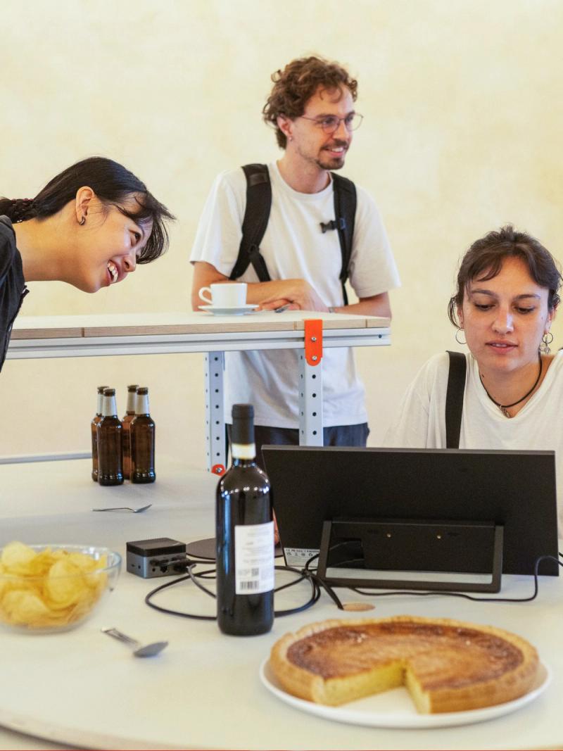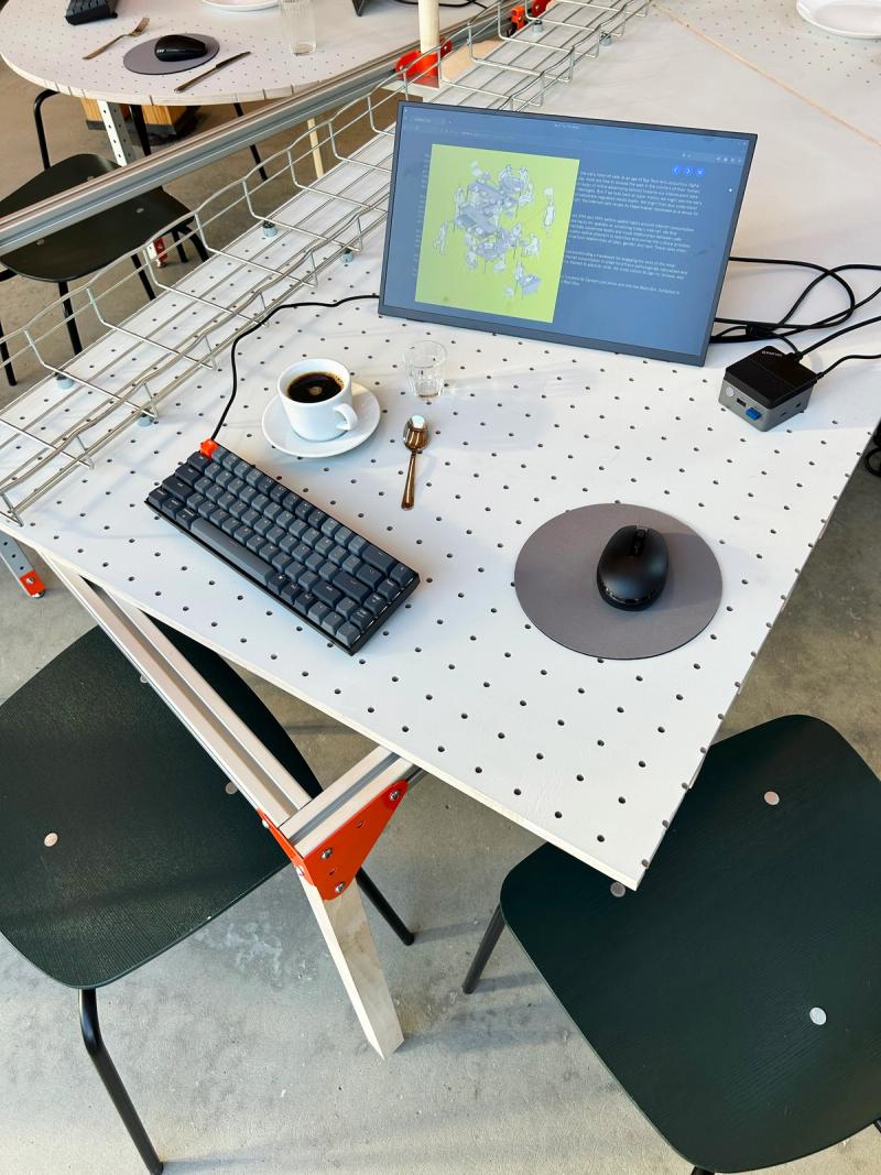 This project investigates the spatiality of the digital through a media-archeological recovery of the early internet cafe. In an age of Big-Tech and ubiquitous digital connectivity, the internet cafe is a relic of a time when the internet revealed itself as place. Today, most are free to browse the web in the comfort of their homes: curtains drawn and nestled behind the veil of iPhone’s privacy mode. We surrender to feedback loops of online advertising tailored towards our individuated data profiles, and we seek out digital communities of consensus to reinforce our political and social ideologies. But if we look back at cyber history we might see the early internet cafe as a complexly negotiated social space that could counter our divisively siloed and corporate-regulated media habits. We might then also understand the internet itself as a social space—one coexistent with the space of internet access. In this light, the internet cafe recalls its Habermasian namesake as a venue for the emergence of public life through encounters with difference, virtual and IRL. Our work began with in-depth research on early internet cafes. Concentrated between the years 1994 and 1995, before spatial habits around internet consumption were normalized, these early cafes exhibit subtle but compelling attributes that could be valuable hacks for spatially re-socializing today’s internet. We find productively awkward attempts to contend with the materiality of digital infrastructure and potentially subversive bodily and visual relationships between cafe occupants. We also find uncanny moments when computers appear anthropomorphized and quietly radical attempts to hybridize and overlay the cultural activities of dining and computing. Further research on today’s remaining internet cafes holds a lens to structural relationships of class, gender, and race. These cafes often provide connectivity to systematically marginalized populations who otherwise lack connection. Drawing on our analyses, our installation is an internet cafe for Palazzo d’Accursio in Bologna. Also constituting a framework for engaging the work of the other exhibition participants, our cafe insists on the materiality of the digital sphere, re-spatializing internet consumption in order to critique pathologically naturalized and desocialized digital habits. The cafe is assembled from a melange of building component systems, hacked to playfully unite. We invite visitors to sign-in, browse, and celebrate connection—digital, social, and tectonic. Winner of the Big Tech and Counter-Technologies Open Call and featured in “Data Materialities” curated by Carmen Lael Hines and Into the Black Box. Exhibited in Sala d’Ercole at the Palazzo d’Accursio in Bologna, Italy alongside works by Morgane Billuart and Raúl Silva. Selected for exhibition in the 2026 Works & Words Biennale. Exhibited in the library at the Aarhus School of Architecture in Aarhus, Denmark. Team: McLain Clutter, Cyrus Peñarroyo, Axel Olson, Krzysztof Lower Year: 2025