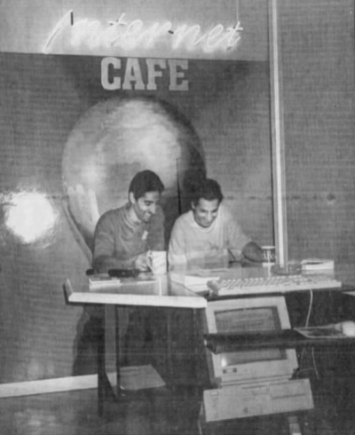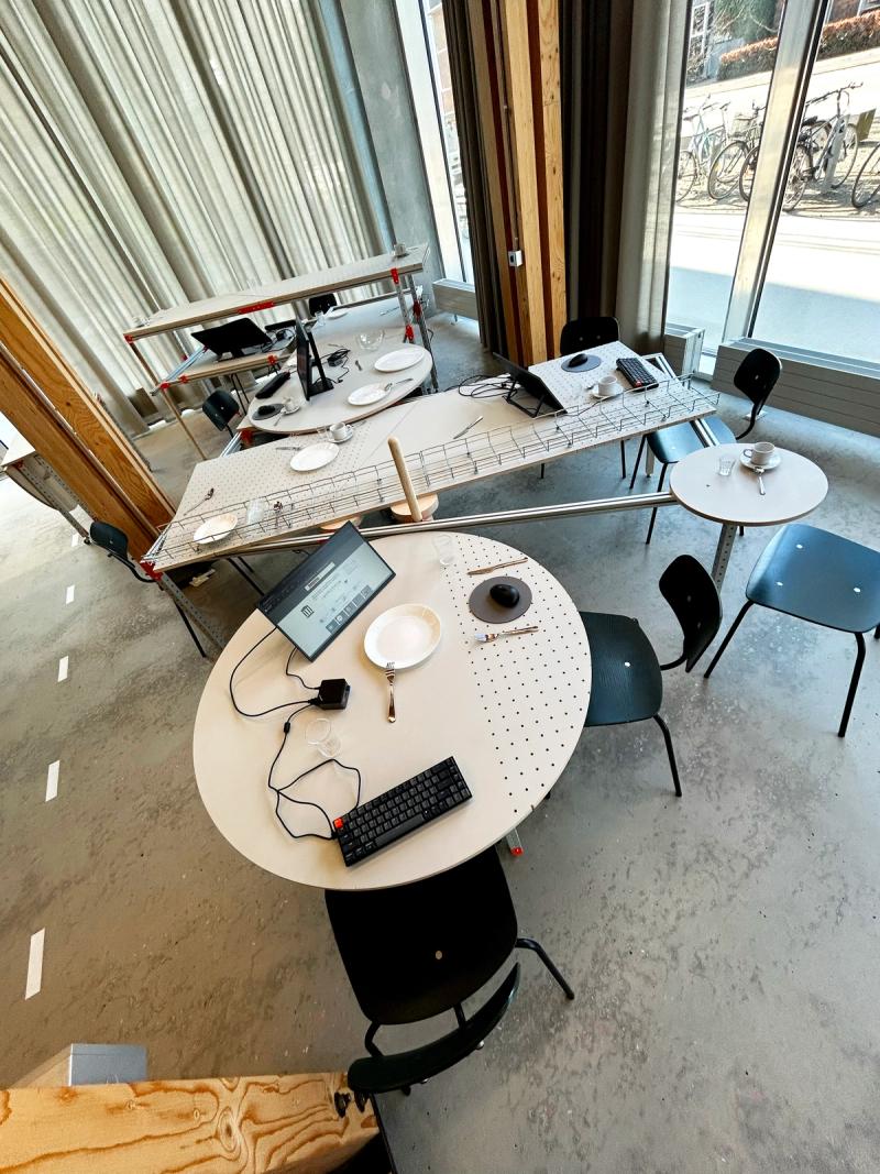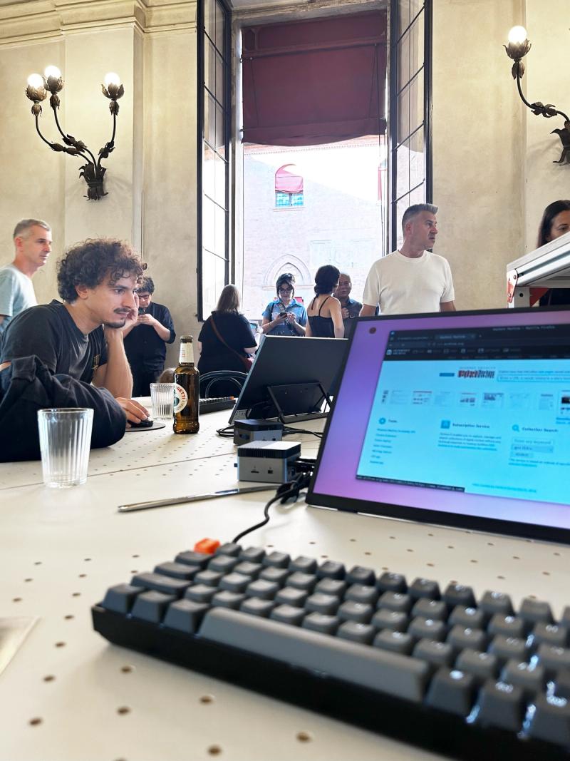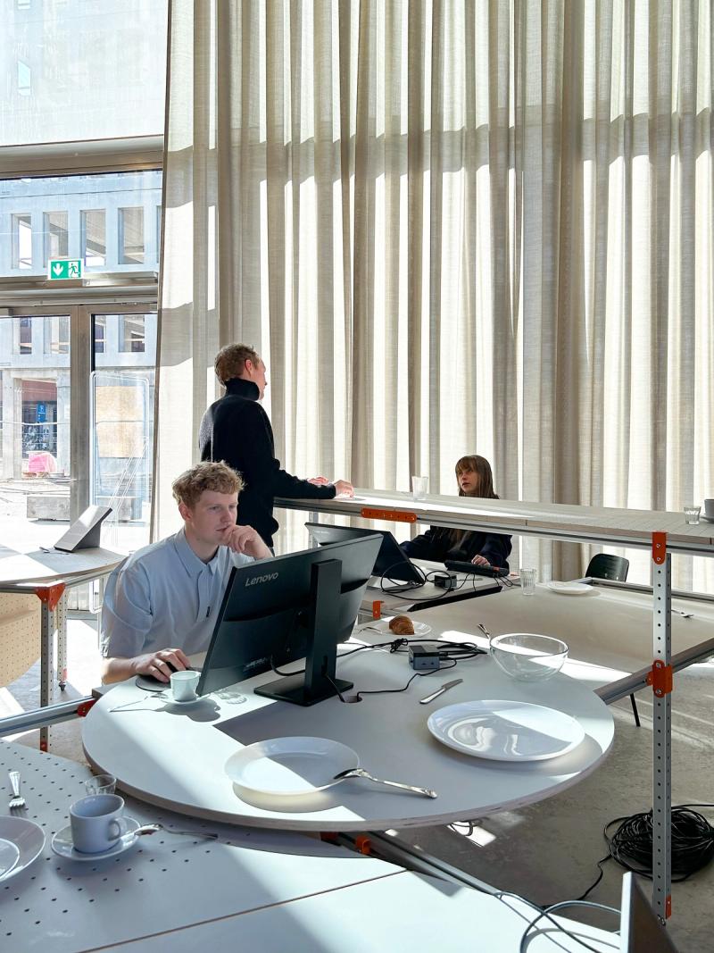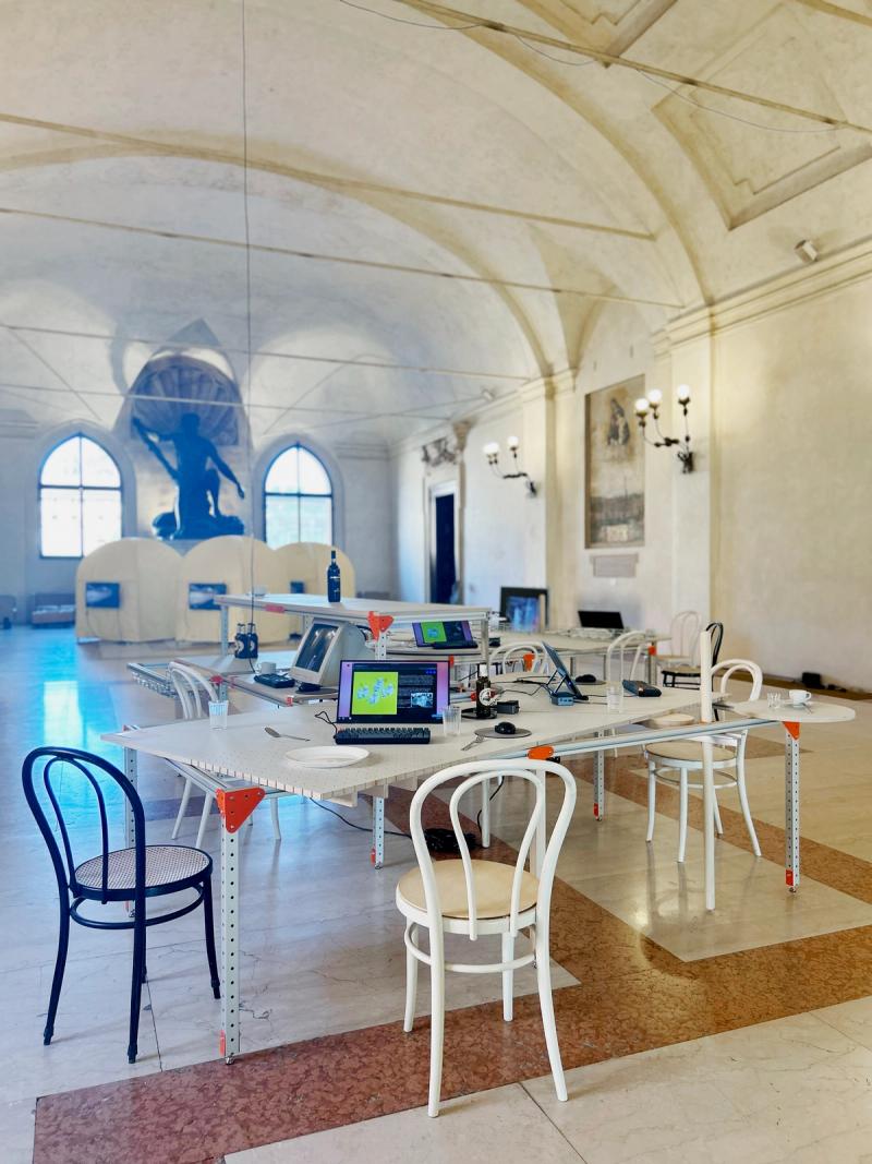 This project investigates the spatiality of the digital through a media-archeological recovery of the early internet cafe. In an age of Big-Tech and ubiquitous digital connectivity, the internet cafe is a relic of a time when the internet revealed itself as place. Today, most are free to browse the web in the comfort of their homes: curtains drawn and nestled behind the veil of iPhone’s privacy mode. We surrender to feedback loops of online advertising tailored towards our individuated data profiles, and we seek out digital communities of consensus to reinforce our political and social ideologies. But if we look back at cyber history we might see the early internet cafe as a complexly negotiated social space that could counter our divisively siloed and corporate-regulated media habits. We might then also understand the internet itself as a social space—one coexistent with the space of internet access. In this light, the internet cafe recalls its Habermasian namesake as a venue for the emergence of public life through encounters with difference, virtual and IRL. Our work began with in-depth research on early internet cafes. Concentrated between the years 1994 and 1995, before spatial habits around internet consumption were normalized, these early cafes exhibit subtle but compelling attributes that could be valuable hacks for spatially re-socializing today’s internet. We find productively awkward attempts to contend with the materiality of digital infrastructure and potentially subversive bodily and visual relationships between cafe occupants. We also find uncanny moments when computers appear anthropomorphized and quietly radical attempts to hybridize and overlay the cultural activities of dining and computing. Further research on today’s remaining internet cafes holds a lens to structural relationships of class, gender, and race. These cafes often provide connectivity to systematically marginalized populations who otherwise lack connection. Drawing on our analyses, our installation is an internet cafe for Palazzo d’Accursio in Bologna. Also constituting a framework for engaging the work of the other exhibition participants, our cafe insists on the materiality of the digital sphere, re-spatializing internet consumption in order to critique pathologically naturalized and desocialized digital habits. The cafe is assembled from a melange of building component systems, hacked to playfully unite. We invite visitors to sign-in, browse, and celebrate connection—digital, social, and tectonic. Winner of the Big Tech and Counter-Technologies Open Call and featured in “Data Materialities” curated by Carmen Lael Hines and Into the Black Box. Exhibited in Sala d’Ercole at the Palazzo d’Accursio in Bologna, Italy alongside works by Morgane Billuart and Raúl Silva. Selected for exhibition in the 2026 Works & Words Biennale. Exhibited in the library at the Aarhus School of Architecture in Aarhus, Denmark. Team: McLain Clutter, Cyrus Peñarroyo, Axel Olson, Krzysztof Lower Year: 2025