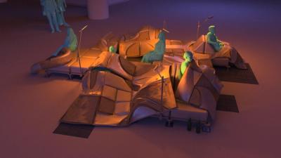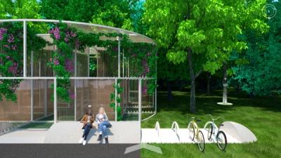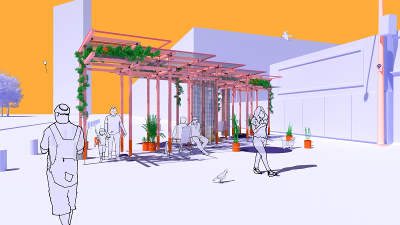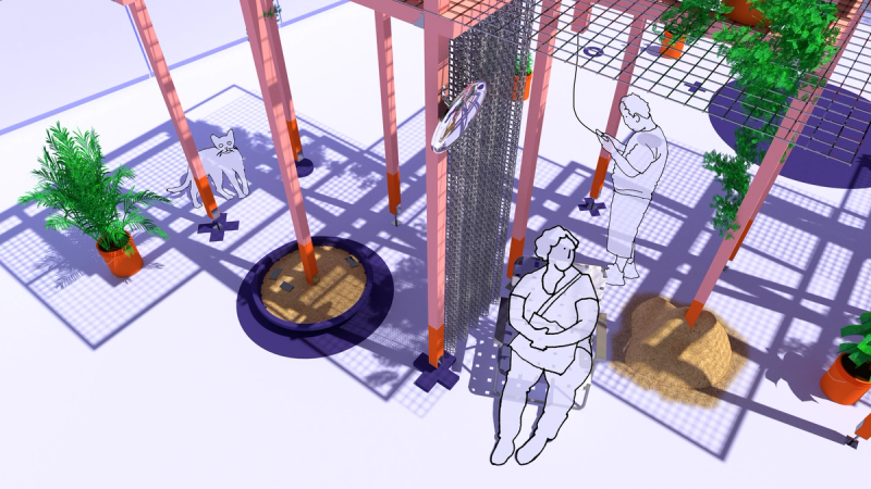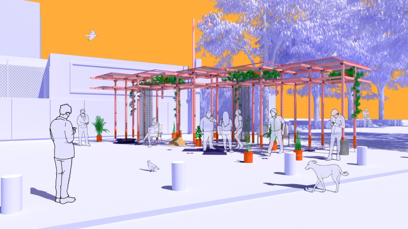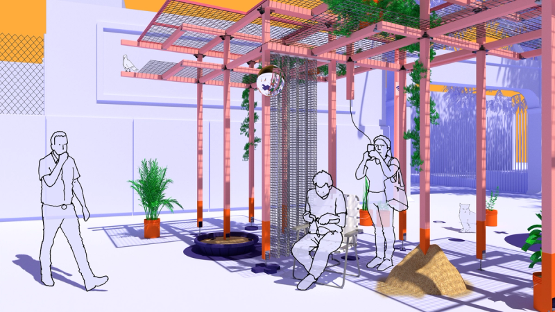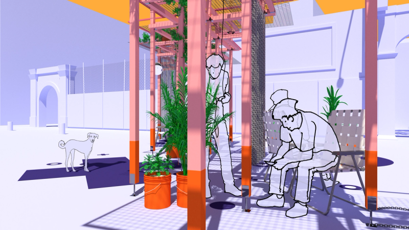 Mexico City has more free Wi-Fi hotspots than any other city in the world, and yet widespread access to a digital connection too often keeps people apart. Scanning the crowd in Alameda or Chapultepec reveals as many heads tilted downward towards screens as friends joined in conversation. Sited next to a free Wi-Fi hotspot adjacent to Parque de la Alameda, Re:Connection leverages Mexico City’s robust internet infrastructure in a design for the MEXTRÓPOLI 2022 Pavilion that aspires to spatially and materially re-socialize our increasingly atomizing internet habits. The proposal consists of a scaffold made of standard dimensional lumber configured to minimize material cuts, and wire mesh that holds potted plants and solar-powered device charging stations. Vines and foliage intertwine with cords and wires, dripping from the sky while shading the ground. Below, a collection of houseplants, folding chairs, a kiddie pool, and other props provide opportunities for device charging and internet browsing. The siting of the pavilion is meant to gently interrupt the typical flow of pedestrian traffic along the sidewalk, while the pavilion itself provides spatial and material contexts that slow down, lag, delay, and buffer our increasingly habituated digital habits. Throughout, connection is celebrated: digital, social, and tectonic. Standard dimensional lumber hanging brackets present as ornament, next to visitors connecting to Wi-Fi and charging stations, aside others connected in conversation chairs or exchanging glances. Team: McLain Clutter, Cyrus Peñarroyo Year: 2022