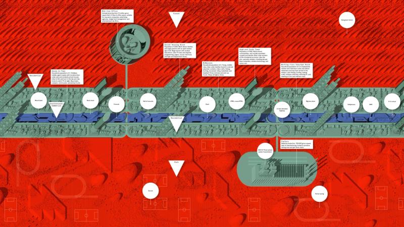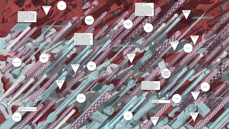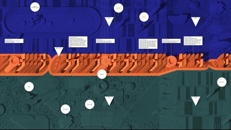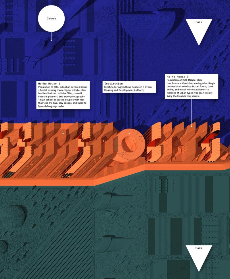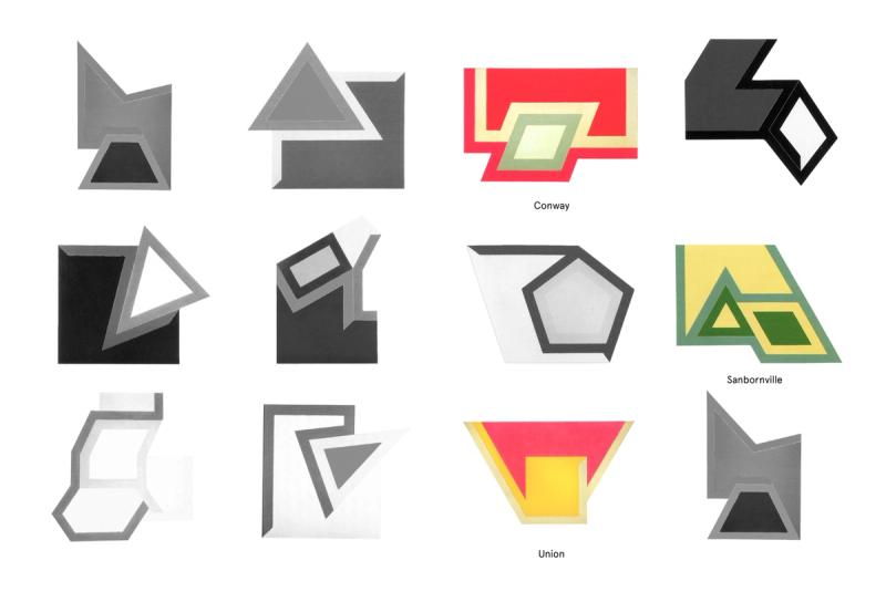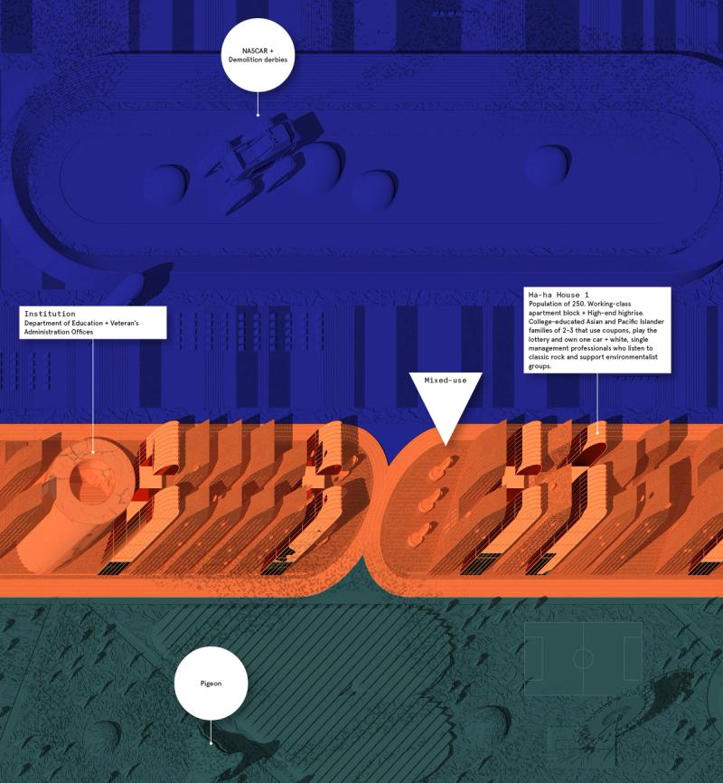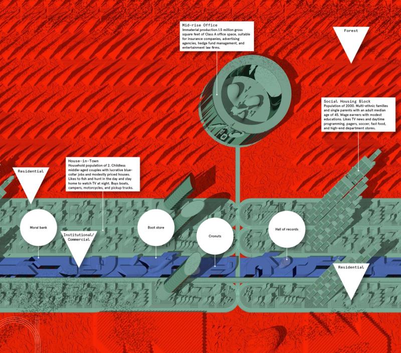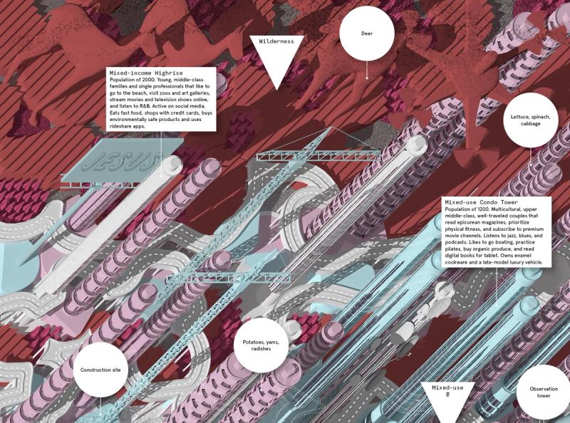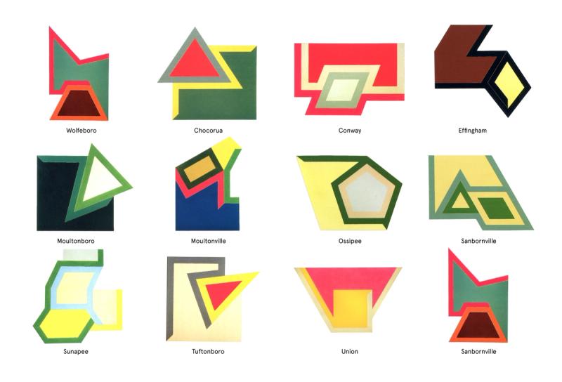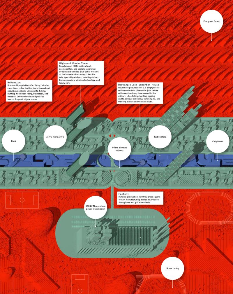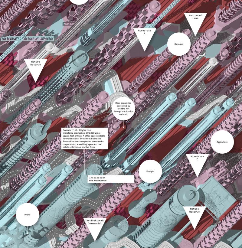 Shaped Places of Carroll County New Hampshire is a spatiopolitical satire about the reciprocity between the identities of political subjects and the built environments that support them. Composing a critical essay and three speculative urban design proposals, the project prompts reflection on the role of the built environment in reinforcing the political divide within the United States, as that divide maps onto the division between urban and rural territories. The work draws upon a purposely absurd combination of references, weaving discussion of urban data collection with analysis of the political geography of New Hampshire, Frank Stella’s Irregular Polygons, and early 20th century deurbanist linear cities. Throughout the analysis, common themes emerge and intertwine, such as the dialogue between shape and content, urban and rural territories, and populations and the precincts in which they are counted. These themes inform the design of three linear cities in Carroll County, New Hampshire. The population of each linear city is organized at a geographic scale to force an agonistic collision of urban and rural lifestyles, as novel adjacencies emerge from the linear patterns of development. Winner of The Architect’s Newspaper “Best of Design Award for Representation” in 2019 and an ACSA Faculty Design Award in 2020. Authors: McLain Clutter, Cyrus Peñarroyo Contributors: Robert Fishman, Clare Lyster Publisher: ORO Editions Assistants: Mike Amidon, Maggie Cochrane, Lucas Denit, Pedro Duhart Benavides, Reed Miller, Anne Redmond, Craig Zehr Year: 2016–21 Shaped Places of Carroll County New Hampshire can be purchased here.
