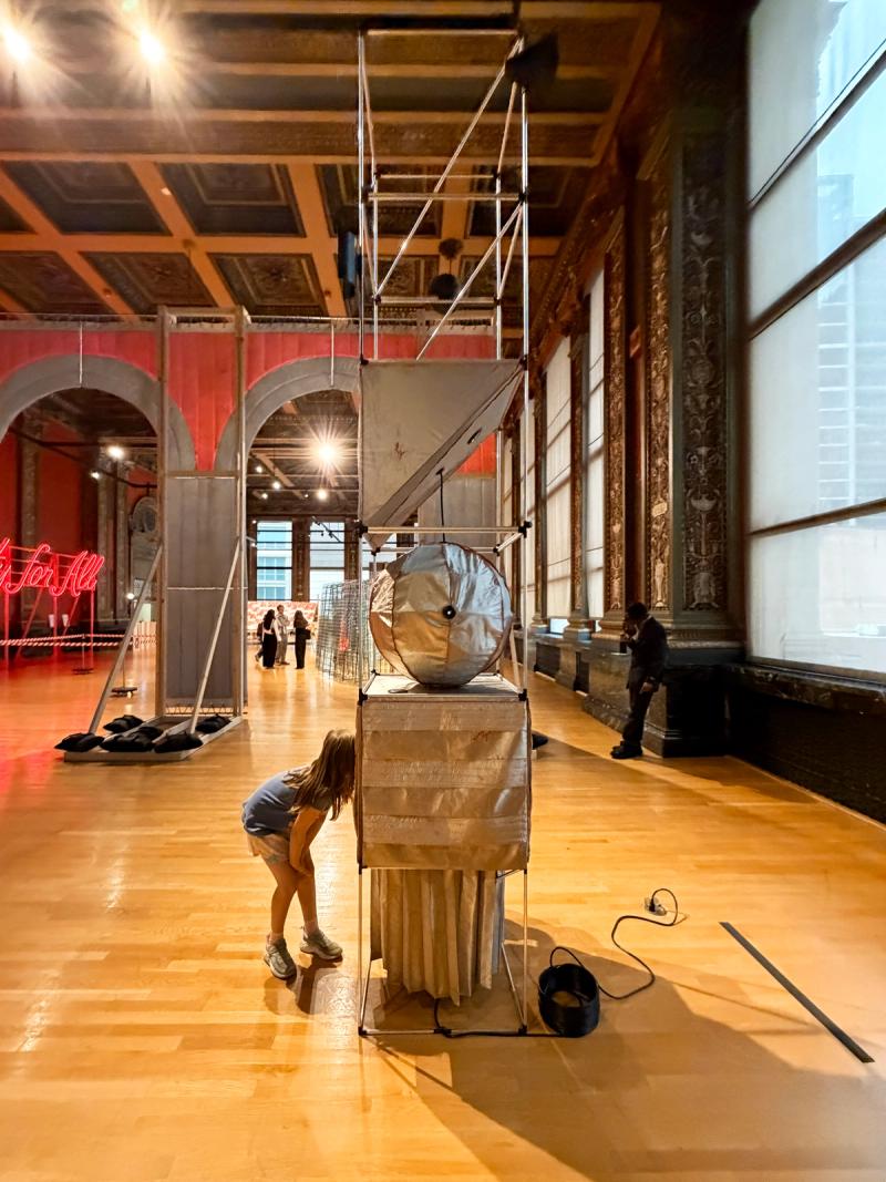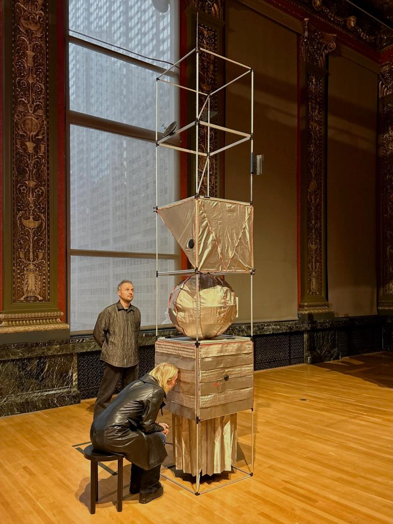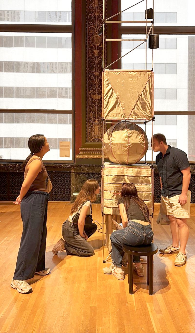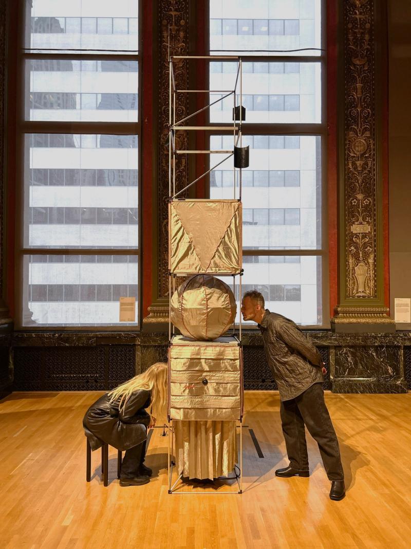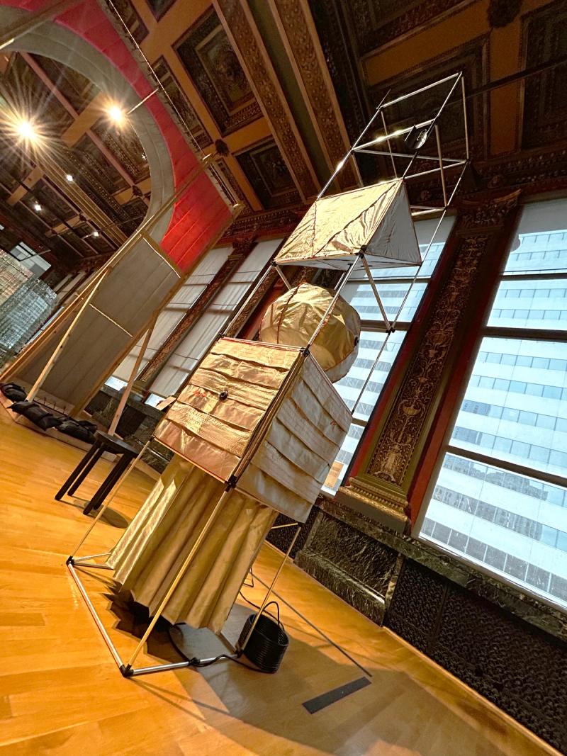Time Capsules is a miniature infrastructure for connection and disconnection. It is both a media-archeological recovery of the raree and a ⅛”=1’ scale model of an anti-antenna for the city of Chicago. An anti-antenna is an imaginary technology used to make place possible in the 21st century. If a regular antenna connects a point in space to multiple other points in space through the reception of electromagnetic waves, an anti-antenna reconnects a point in space to its point in space by resisting those waves, the onslaught of digital distraction they sponsor, and the claim they make on time. The raree is a form of peep show that emerged in Europe in the 15th century, later spreading across the world. Most rarees were some form of ornamented wooden cabinet with one or multiple peep holes to view the inside. Peering within, the viewer found immersive tiny worlds—little vivariums composed of puppets, maquettes, pictures, and paintings. Often displayed on city streets or in carnivals, rarees were public forms of media consumption. Time Capsules is composed of six vertically stacked 2'x2’x2' frame units assembled from ½”-diameter aluminum tubes with custom black rubberized fittings at the corners of the units. Inside the frame are multiple volumes composed of faraday fabric, a composite textile that has been woven with copper thread in order to block the transmission of electromagnetic waves. Within are tiny interior worlds, cut off from the pervasiveness of digitally-regulated time. By viewing through lensed apertures in each capsule, visitors are invited to experience a different vantage of the surrounding Yates Gallery at the Chicago Cultural Center. In these views, the gallery has also been covered in faraday fabric, blurring the distinction between the inside of the capsule and the outside of the gallery. In each scene, an ill-defined reflective sphere floats in and out of the frame. Somewhat amorphous, answering to alternative physics, the slow-motion of the sphere seems to exist out of time, in order to return viewers to their time and space. Visitors are invited to engage the installation in the round—to view through peepholes in various surfaces and negotiate one another in space, as they engage the enclosed worlds within through slow and durational examination. Invited participant for SHIFT: Architecture in Times of Radical Change, the sixth edition of the Chicago Architecture Biennial. Exhibited in the Yates Gallery at the Chicago Cultural Center. Team: McLain Clutter, Cyrus Peñarroyo, Martin Rodriguez Jr., Nancy Lynch Year: 2025