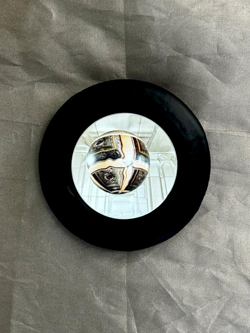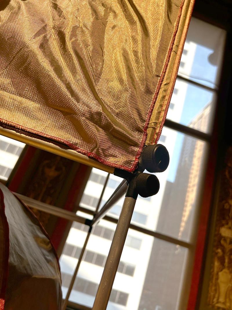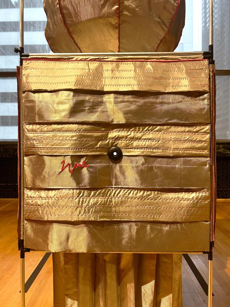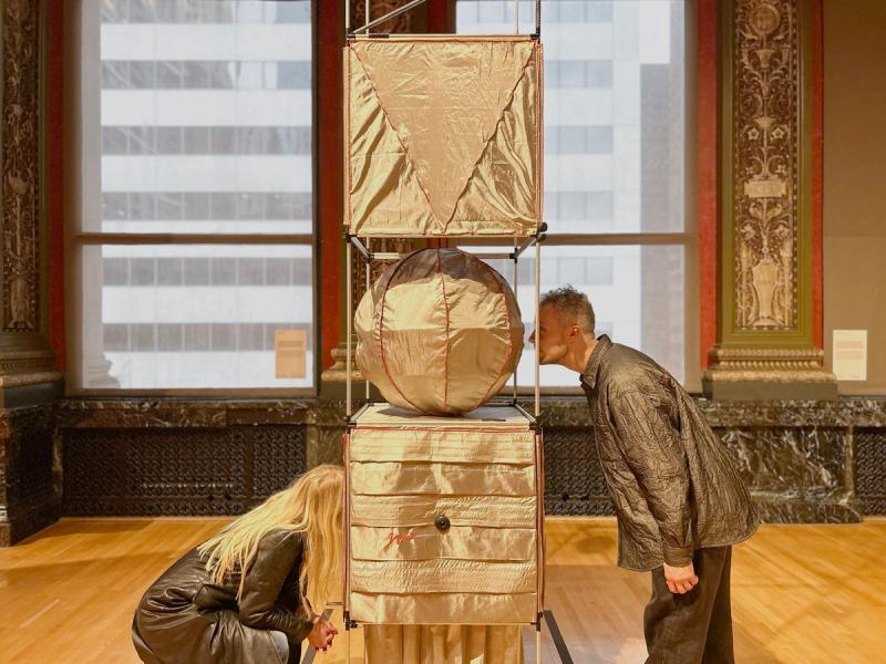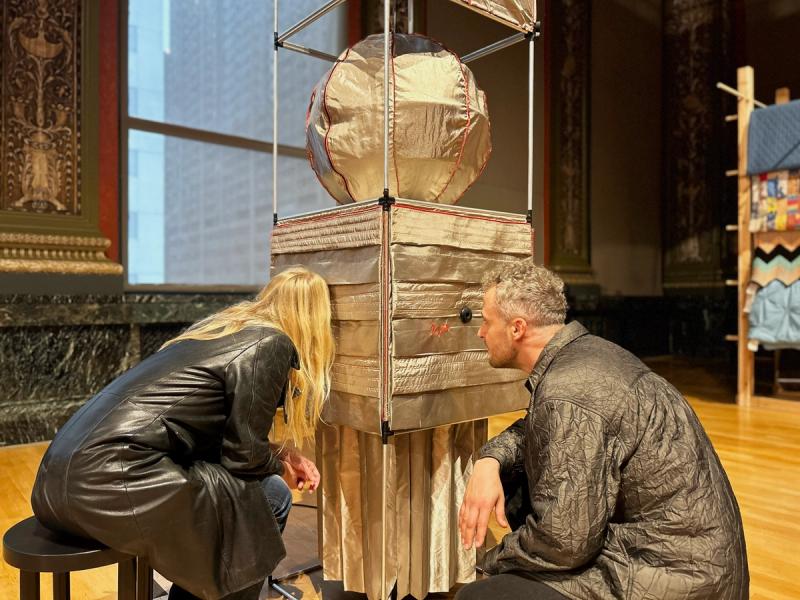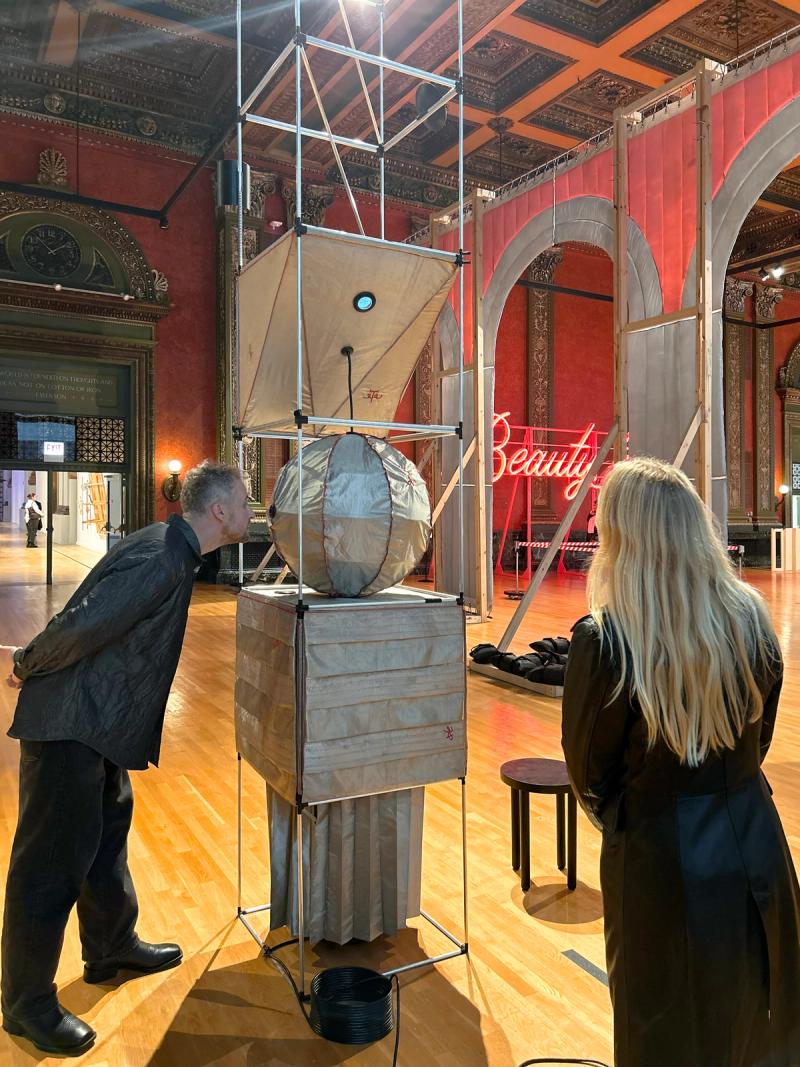 Time Capsules is a miniature infrastructure for connection and disconnection. It is both a media-archeological recovery of the raree and a ⅛”=1’ scale model of an anti-antenna for the city of Chicago. An anti-antenna is an imaginary technology used to make place possible in the 21st century. If a regular antenna connects a point in space to multiple other points in space through the reception of electromagnetic waves, an anti-antenna reconnects a point in space to its point in space by resisting those waves, the onslaught of digital distraction they sponsor, and the claim they make on time. The raree is a form of peep show that emerged in Europe in the 15th century, later spreading across the world. Most rarees were some form of ornamented wooden cabinet with one or multiple peep holes to view the inside. Peering within, the viewer found immersive tiny worlds—little vivariums composed of puppets, maquettes, pictures, and paintings. Often displayed on city streets or in carnivals, rarees were public forms of media consumption. Time Capsules is composed of six vertically stacked 2'x2’x2' frame units assembled from ½”-diameter aluminum tubes with custom black rubberized fittings at the corners of the units. Inside the frame are multiple volumes composed of faraday fabric, a composite textile that has been woven with copper thread in order to block the transmission of electromagnetic waves. Within are tiny interior worlds, cut off from the pervasiveness of digitally-regulated time. By viewing through lensed apertures in each capsule, visitors are invited to experience a different vantage of the surrounding Yates Gallery at the Chicago Cultural Center. In these views, the gallery has also been covered in faraday fabric, blurring the distinction between the inside of the capsule and the outside of the gallery. In each scene, an ill-defined reflective sphere floats in and out of the frame. Somewhat amorphous, answering to alternative physics, the slow-motion of the sphere seems to exist out of time, in order to return viewers to their time and space. Visitors are invited to engage the installation in the round—to view through peepholes in various surfaces and negotiate one another in space, as they engage the enclosed worlds within through slow and durational examination. Invited participant for SHIFT: Architecture in Times of Radical Change, the sixth edition of the Chicago Architecture Biennial. Exhibited in the Yates Gallery at the Chicago Cultural Center. Team: McLain Clutter, Cyrus Peñarroyo, Martin Rodriguez Jr., Nancy Lynch Year: 2025
